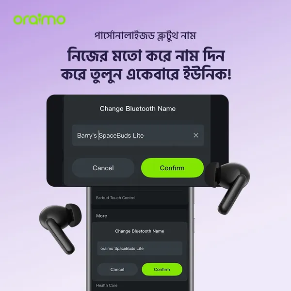 oraimo sound অ্যাপ দিয়ে কয়েক সেকেন্ডেই ডিভাইসের নাম পরিবর্তন করুন, আর প্রতিবার কানেক্ট করার সময় আপনার SpaceBuds Lite-কে করে তুলুন আলাদা।